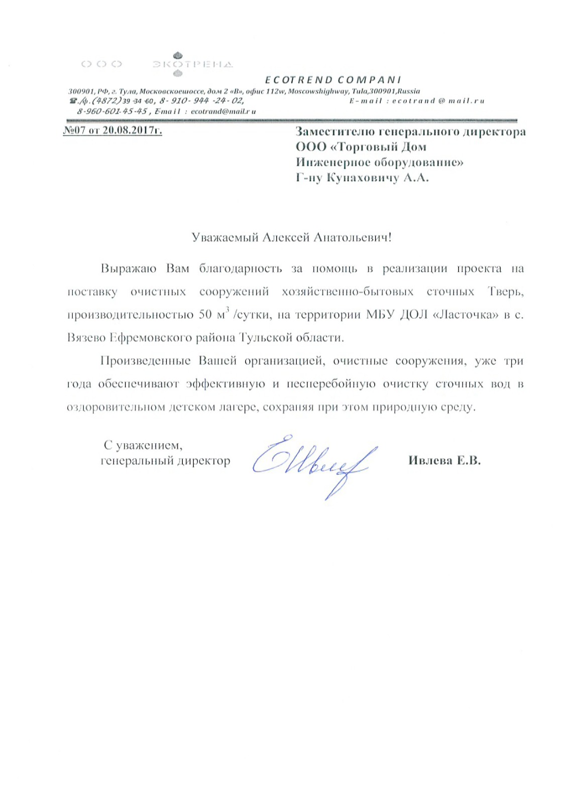 Клиенты выбирают "Инженерное оборудование" за высокое качество оборудования и профессиональные услуги по проектированию, изготовлению и моньаже очистных сооружений. Предлагаемая нами продукция имеет все необходимые сертификаты и свидетельства и разрешена к эксплуатации на территории Российской Федерации.